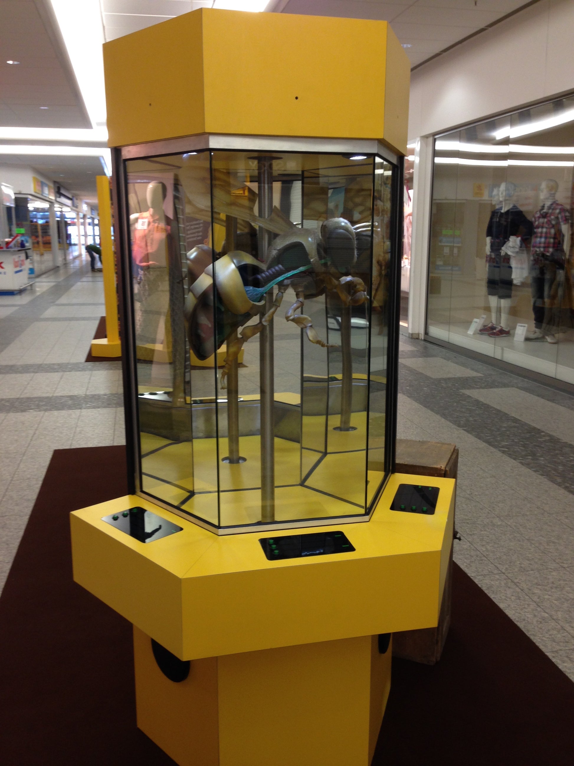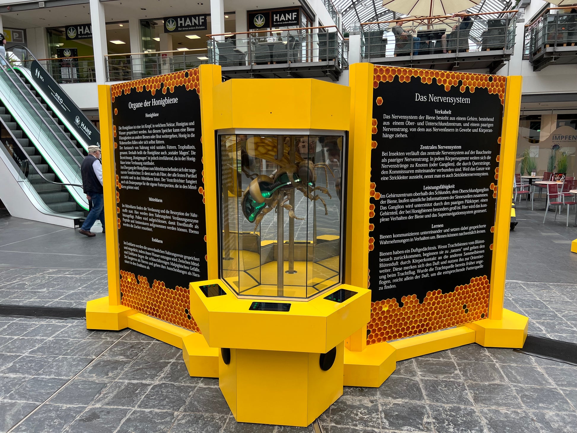 Die Betrachter des Exponates können per Knopfdruck Audiobeschreibungen in deutscher und englischer Sprache anwählen. Passend dazu leuchten die entsprechenden Organe der Biene auf.