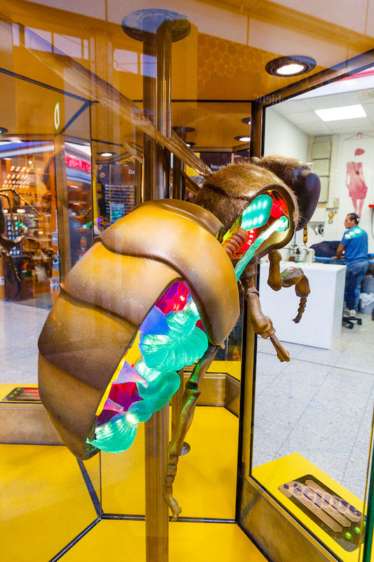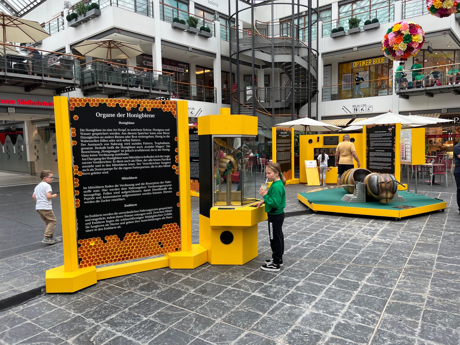 Ein großes offenes Bienenkörper-Modell ermöglicht Einblick in die inneren Organe einer Biene. Wussten Sie zum Beispiel, dass eine Biene kein Herz, wie wir es kennen haben, sondern einen Herzschlauch?