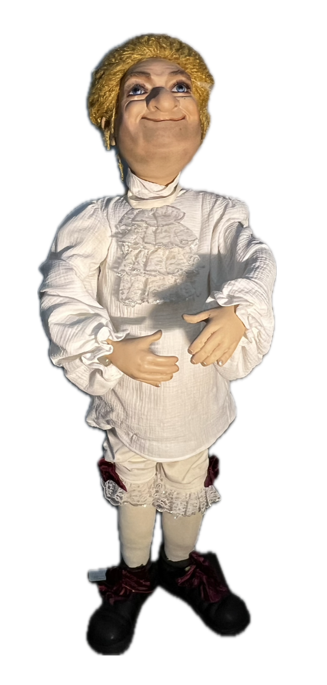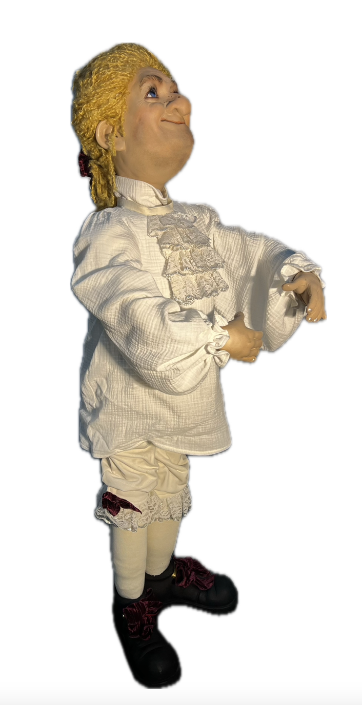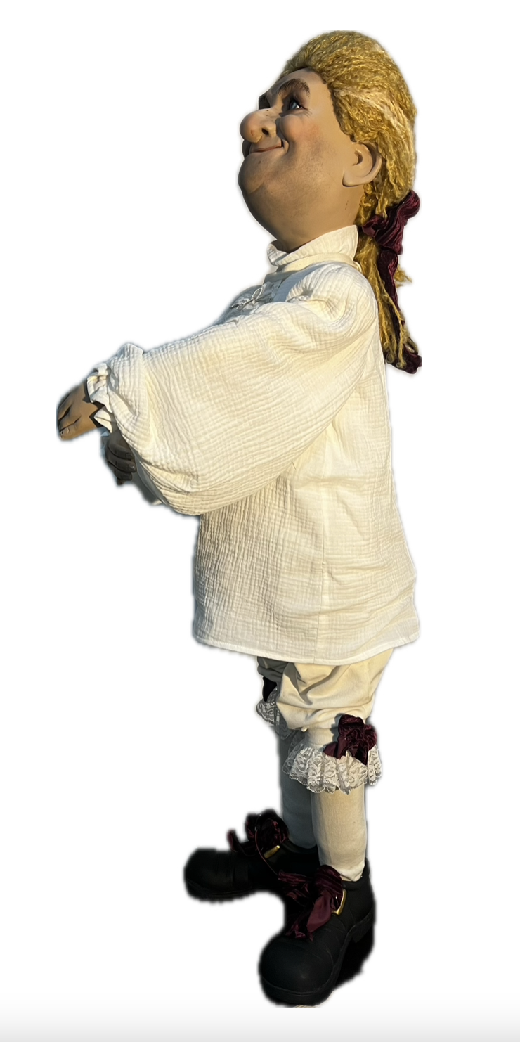 Ausstattung: Schuhe aus Polyurethan, Frisur mit Zopf, Kniebundhose, Nachthemd kurz
