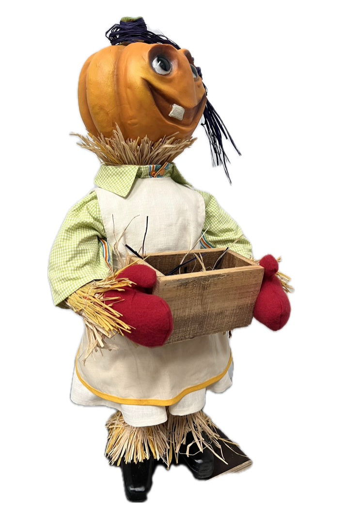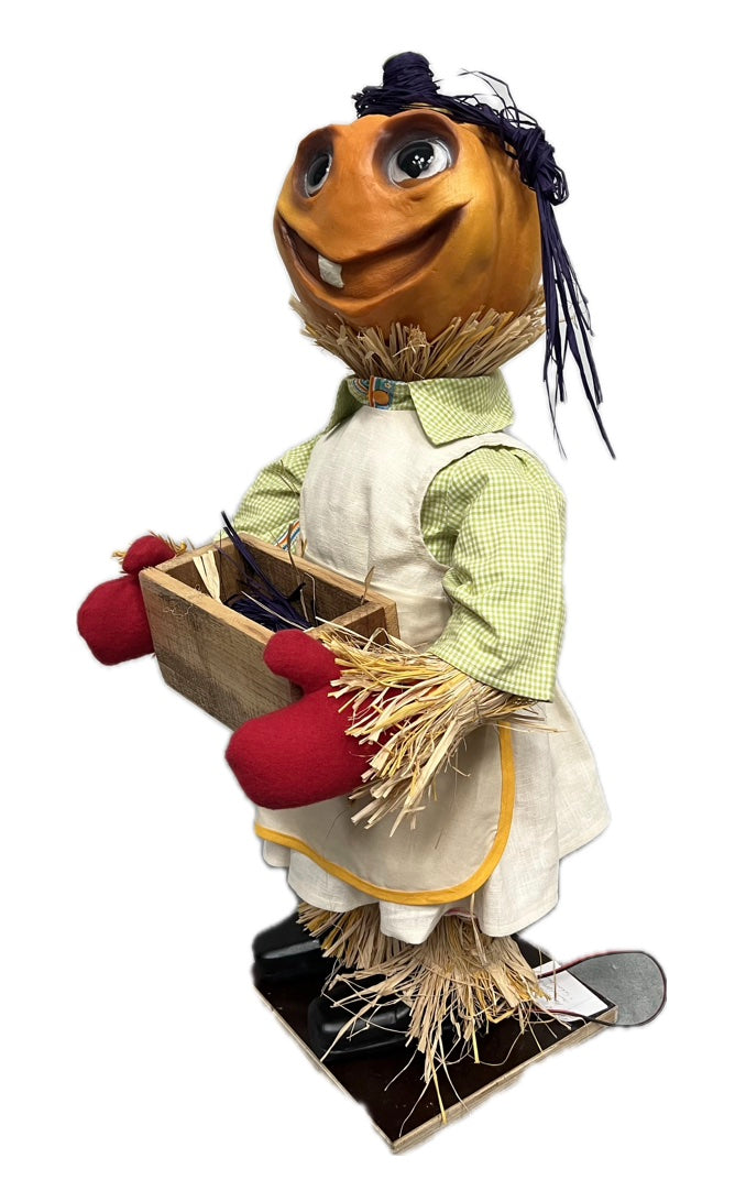 This movable figure was once part of a Halloween decoration in a shopping center's activity area. The figure performs a hip movement. The wooden box can be used to decorate small Halloween items.