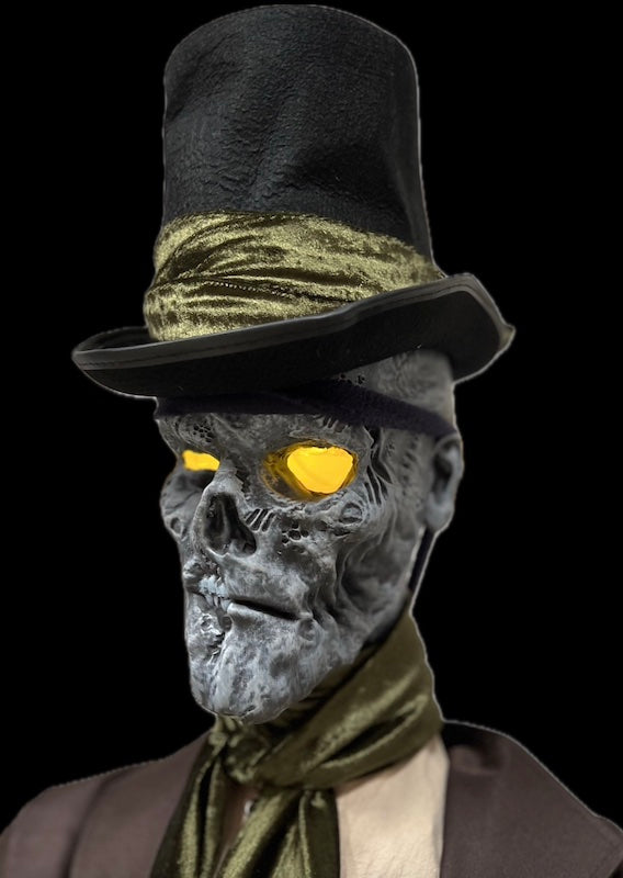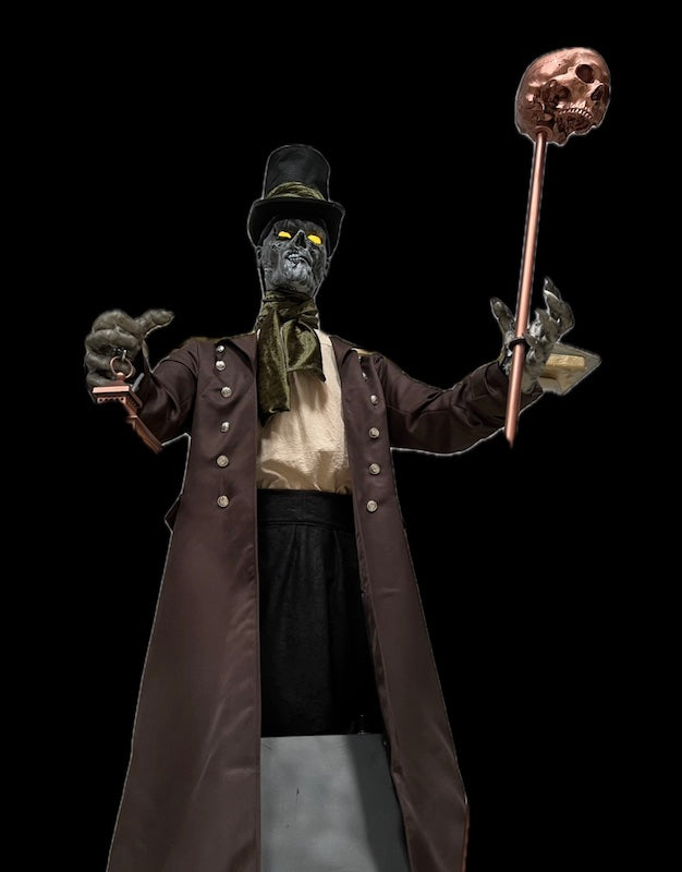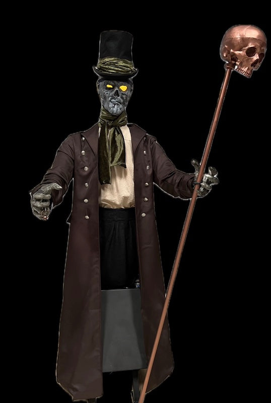 Features: Lantern with flickering light, staff with skull, coachman's coat, head with glowing eyes, sound system, control system with input for spring switch or light switch, digital memory for sound and motion control.