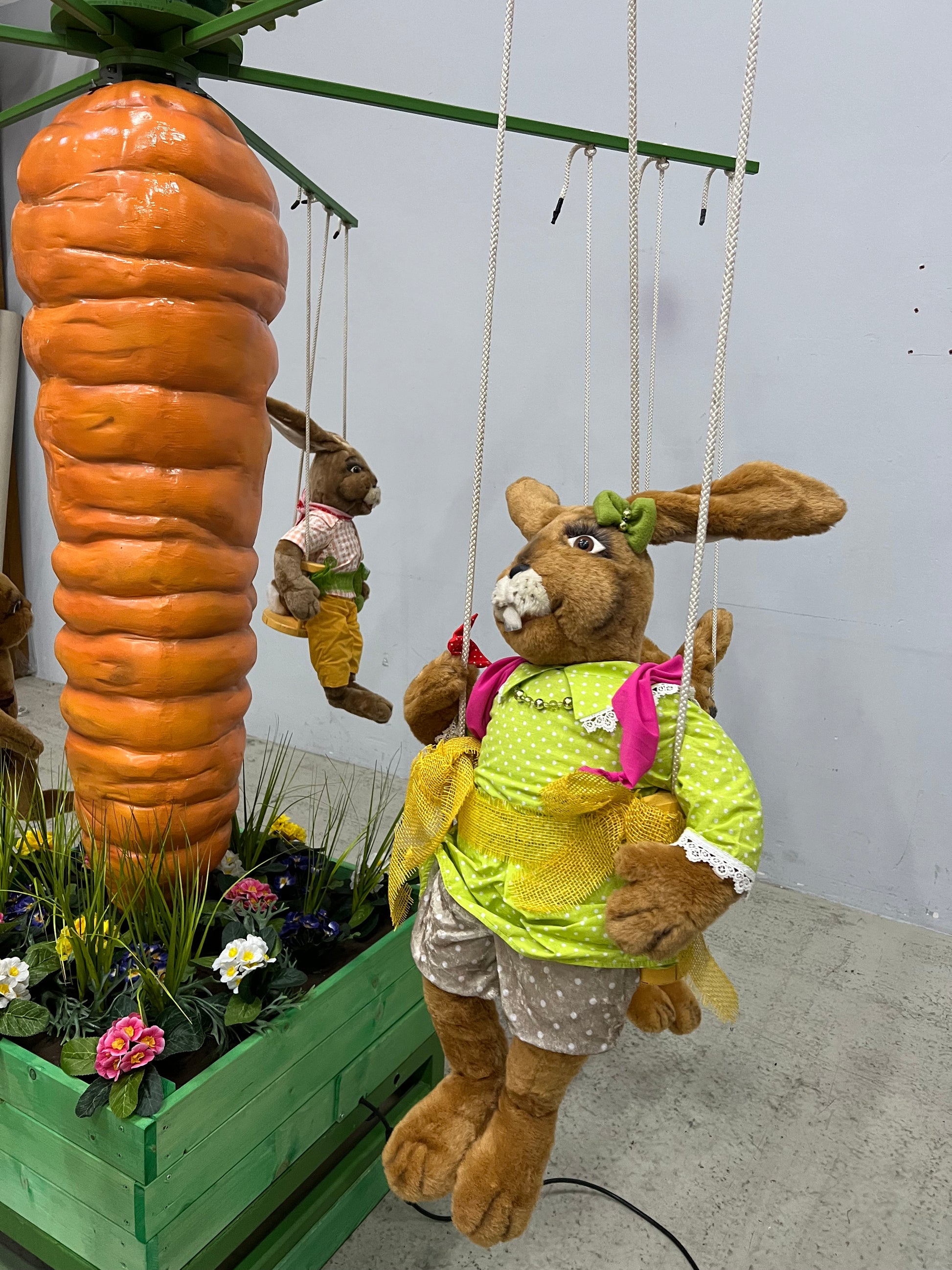 Diese bewegliche Attraktion sorgt für Aktion auf jeder österlichen Aktionsfläche. 6 Osterhasen drehen mit maximal 40 U/pm um eine übergroße Rübe / Möhre.