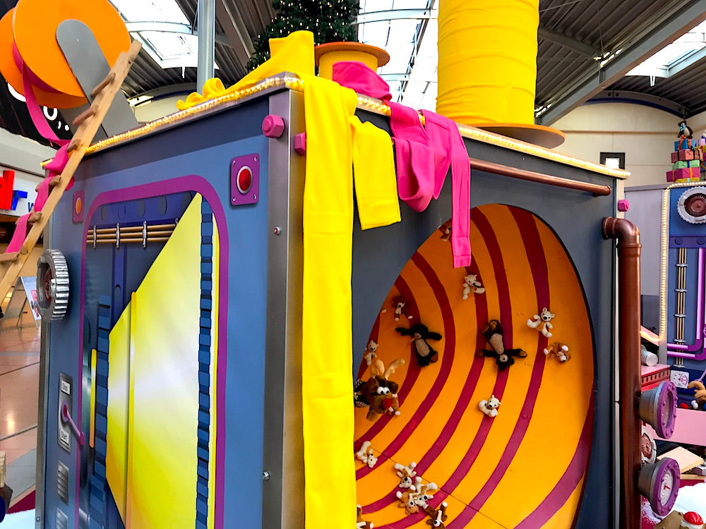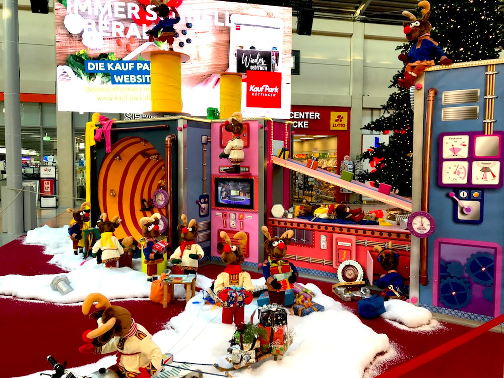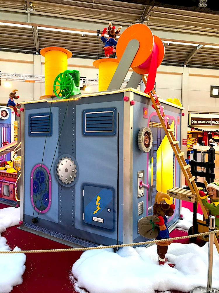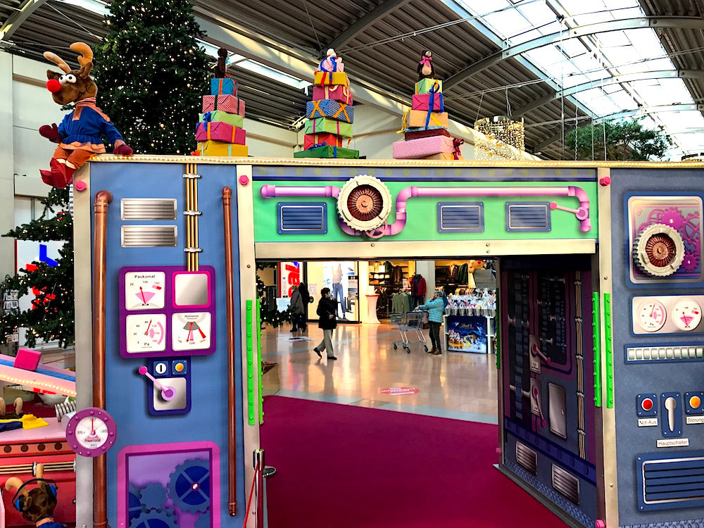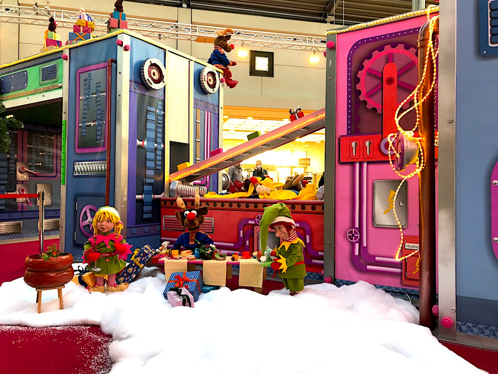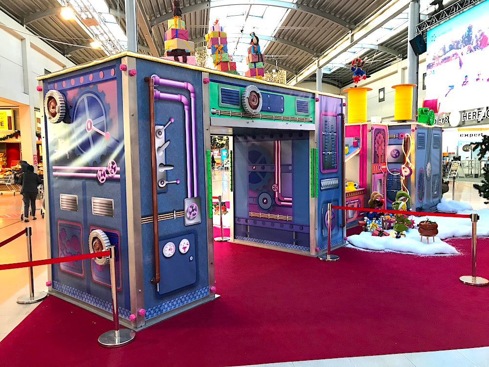Dekorationselemente: 1 x große drehende Trommel, 1 x Förderband mit Rundlauf, 1 x 32 Zoll Monitor mit Animationsfilm, 1 x Aluminium Traversensystem für den Publikumsdurchgang, 1 x Linearführung für drehende Geschenk-Stapel, Verkleidungselemente mit bedrucktem Planenstoff, 6 x rotierende Zahnräder, 3 x rotierende Spulen mit Geschenkbändern, 1 x Gabelstapler mit Palette, 12 x bewegliche Figuren: