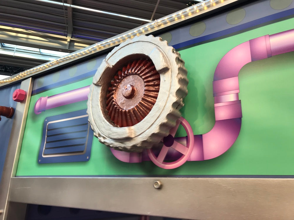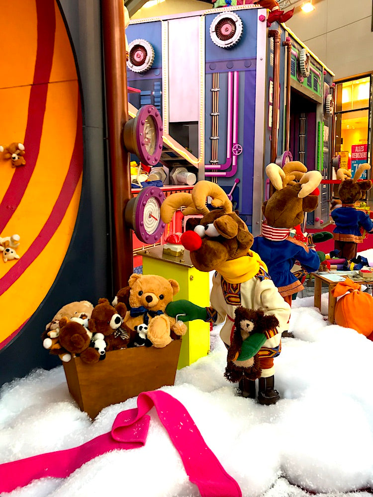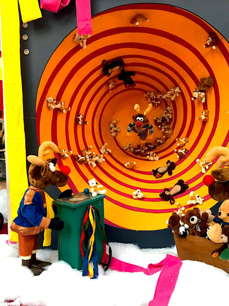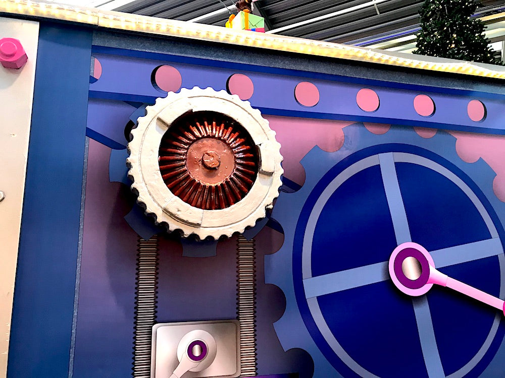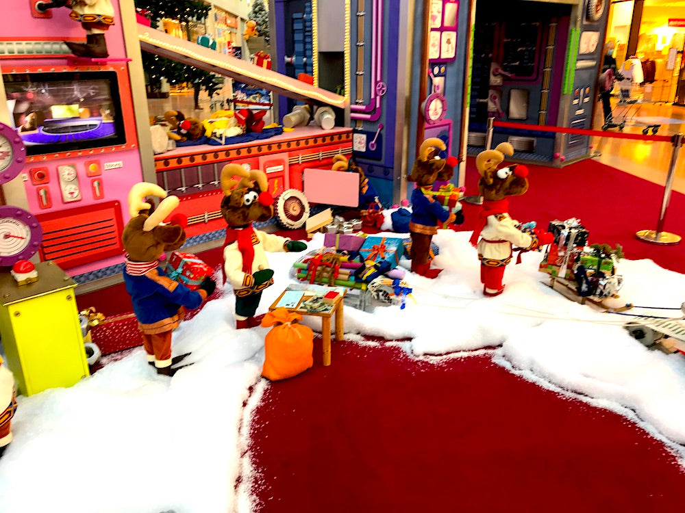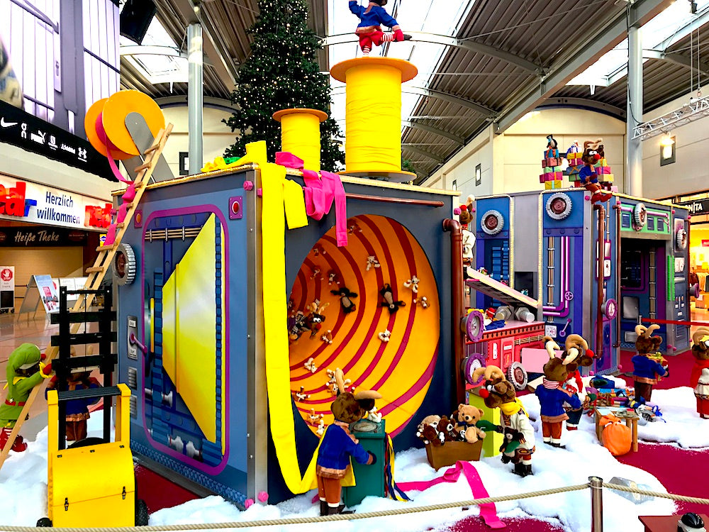 Dekorationselemente: 1 x große drehende Trommel, 1 x Förderband mit Rundlauf, 1 x 32 Zoll Monitor mit Animationsfilm, 1 x Aluminium Traversensystem für den Publikumsdurchgang, 1 x Linearführung für drehende Geschenk-Stapel, Verkleidungselemente mit bedrucktem Planenstoff, 6 x rotierende Zahnräder, 3 x rotierende Spulen mit Geschenkbändern, 1 x Gabelstapler mit Palette, 12 x bewegliche Figuren: