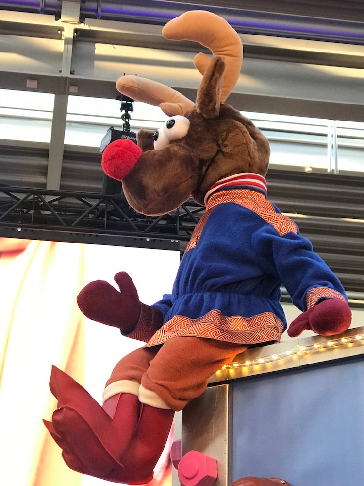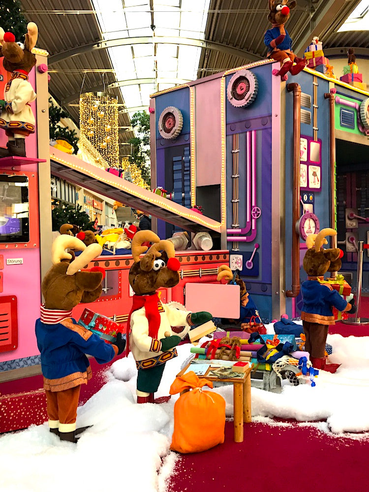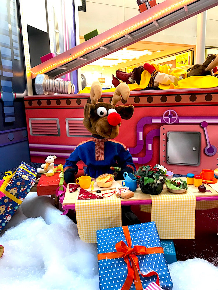 Rudi ist ein Rentier und hat 11 Helfer, die mit der 11 Meter langen und 2,5 Meter breiten Geschenkverpackungsmaschine scheinbar Weihnachtsgeschenke verpacken.
