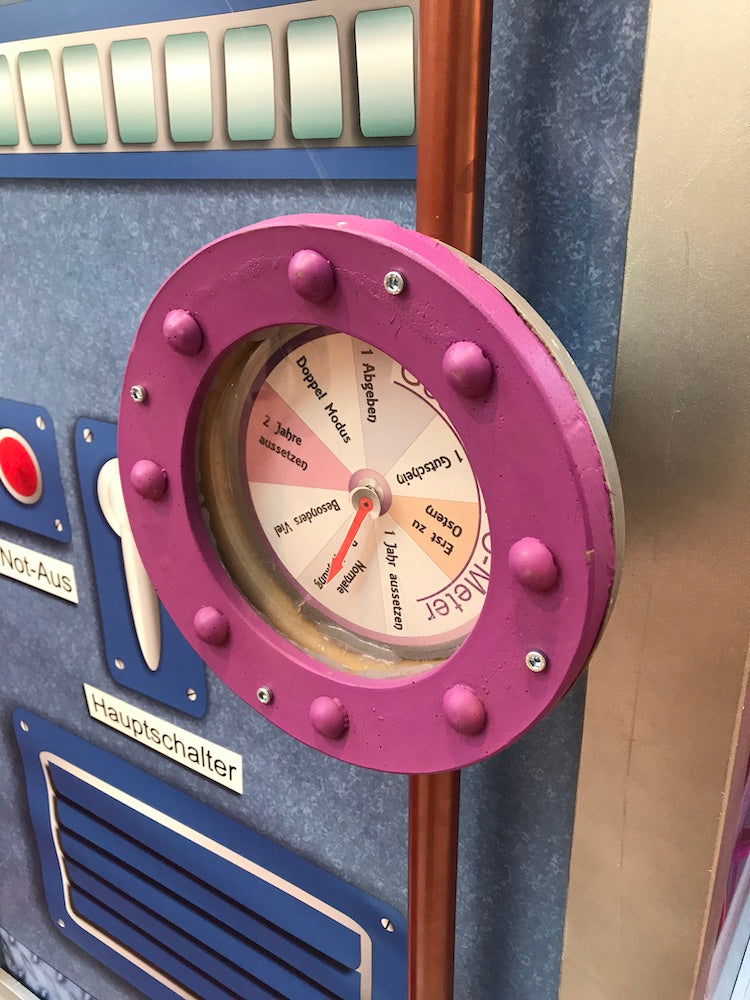 Dekomaterial: Suppentopf, Wagen mit Teddys, Maschinentelegraph, Tisch, mit Gedeck, Becher, Lebensmittelattrapen.