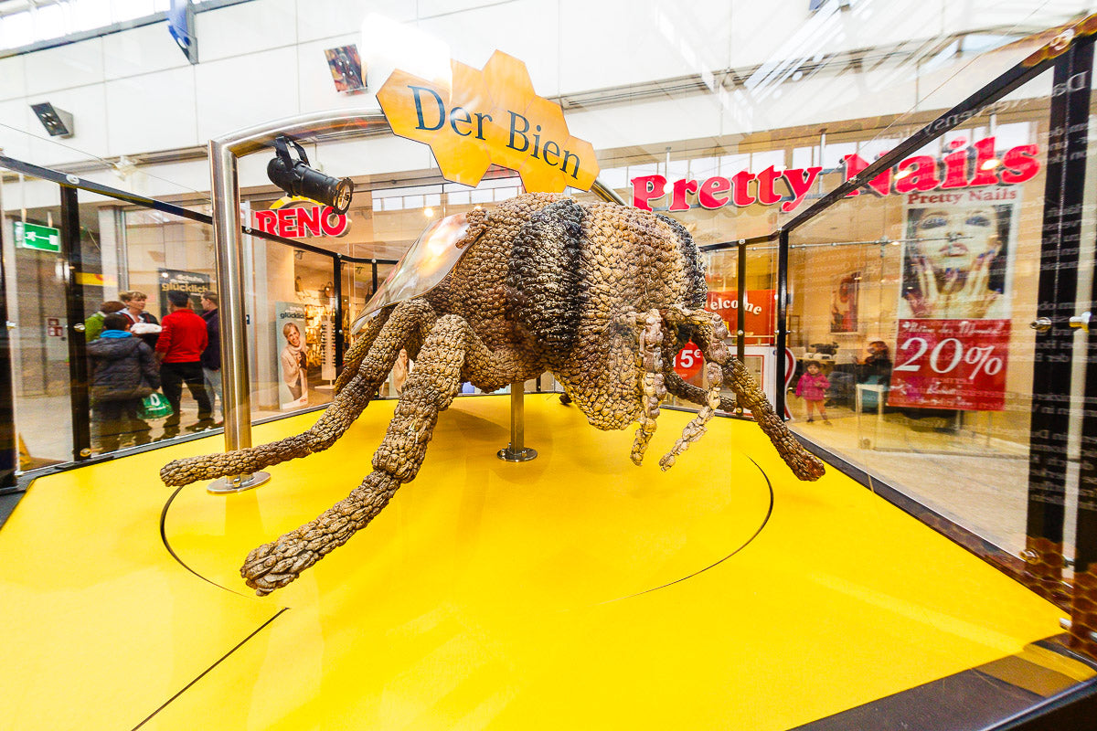In diesem Schaukasten sehen Sie ein stark vergrößertes Bienenmodell aus kleinen Bienen dargestellt. "Der Bien" bezeichnet den Superorganismus des Bienenvolkes, in dem Honigbienen in Gemeinschaft leben. Das Bienenmodell dreht sich.