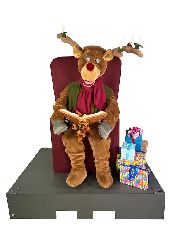Bringen Sie die Magie der Weihnachtszeit zum Leben mit dieser beeindruckenden, 180 cm großen Rentier-Figur. Ausgestattet mit 7 fließenden Bewegungen und einer audio-gesteuerten Erzählfunktion, sitzt das Rentier majestätisch in einem gepolsterten Holzsessel, platziert auf einem stabilen Bühnenpodest. Eine perfekte Ergänzung für Winterdekorationen, Themenwelten und festliche Veranstaltungen.
