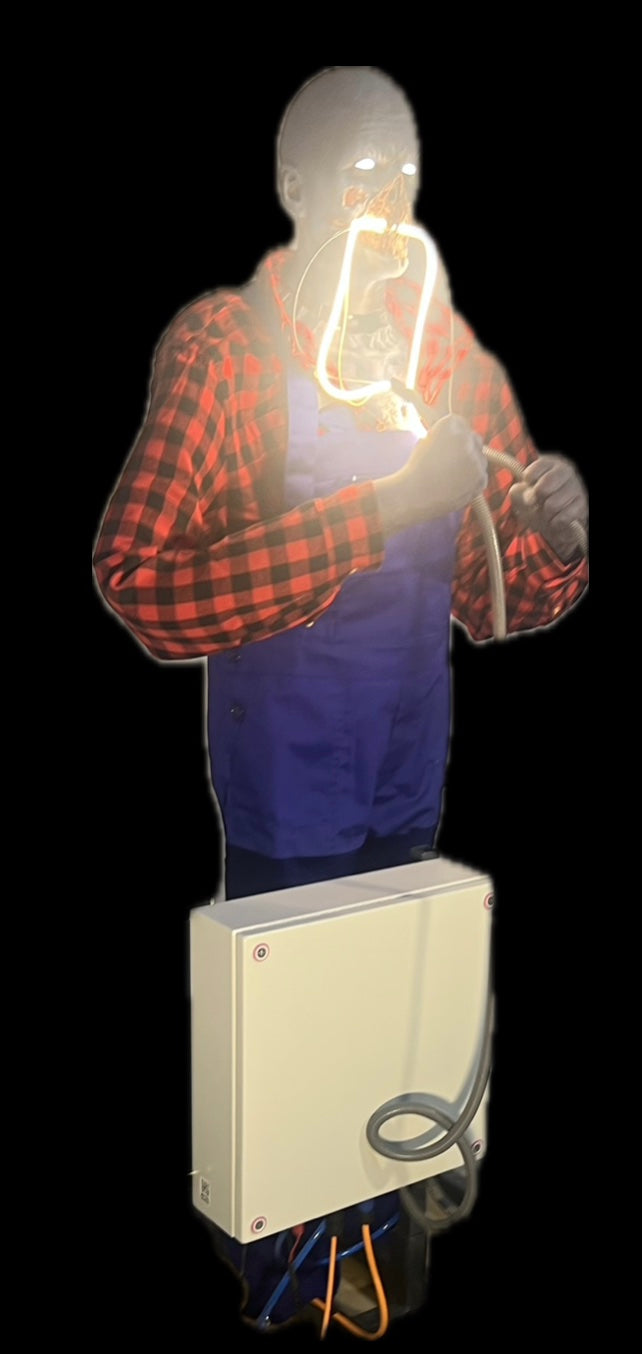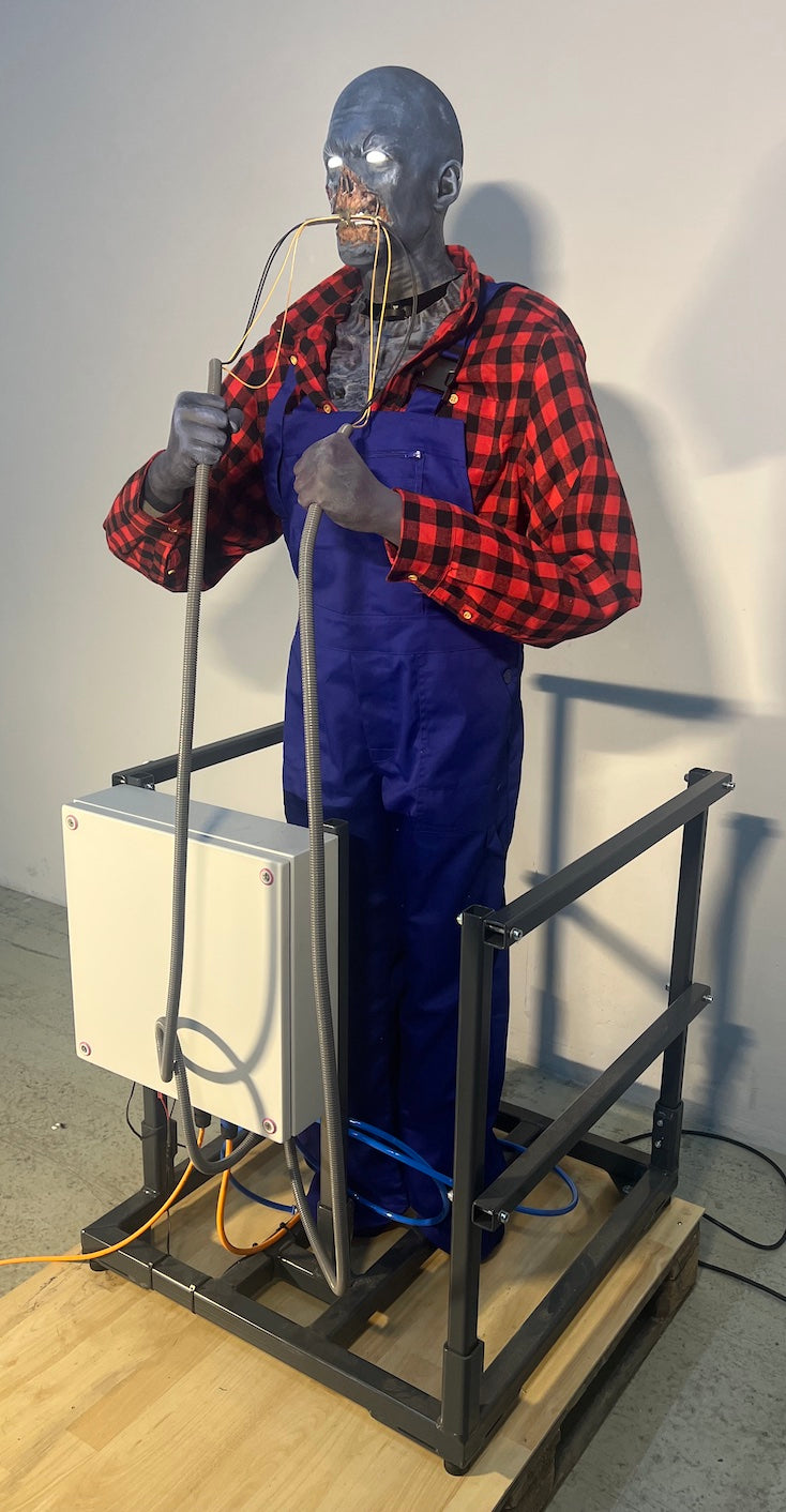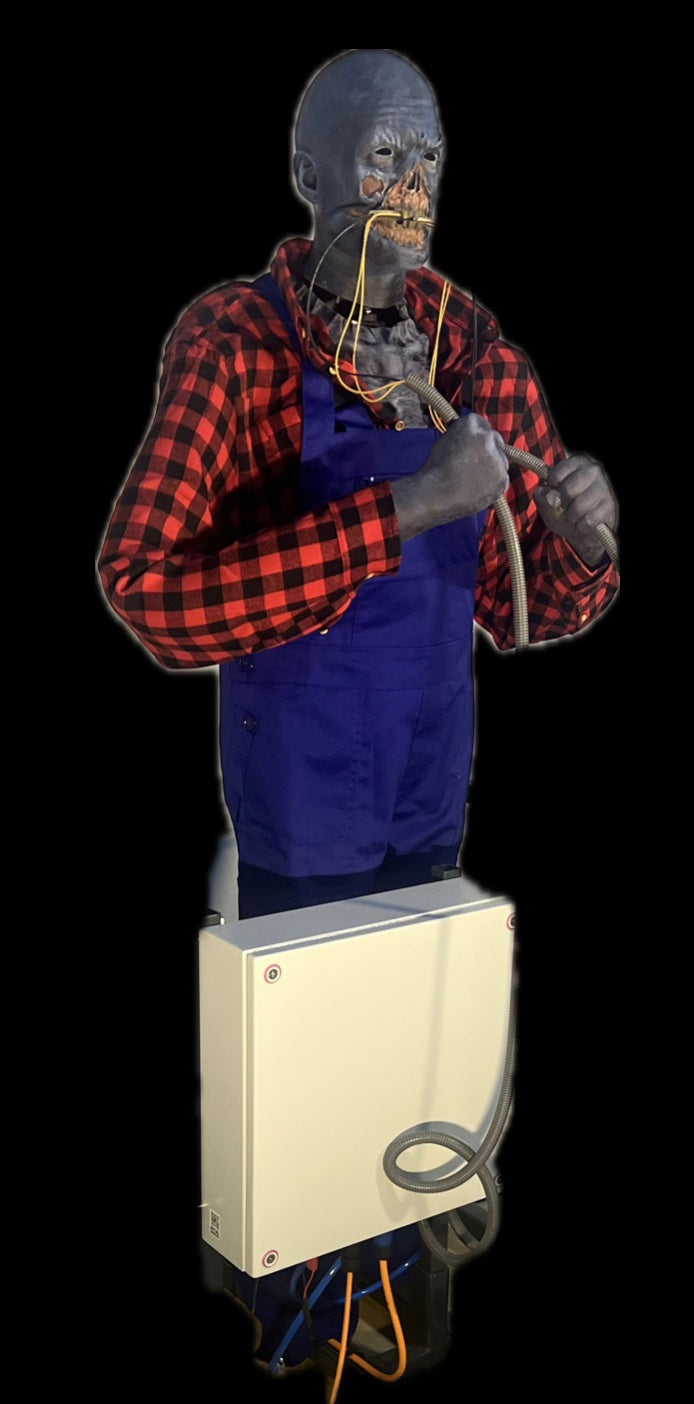 Kopfbewegung und Armbewegung gummigelagert mit pneumatischem Antrieb,toller Lichteffekt der durchgebissenen Kabel, Auslöser der Aktion per Federschalter. Steuerung im Schaltschrank, Sundmodul mit MP3 Soeicher, Verstärker und Lautsprecher inklusive.