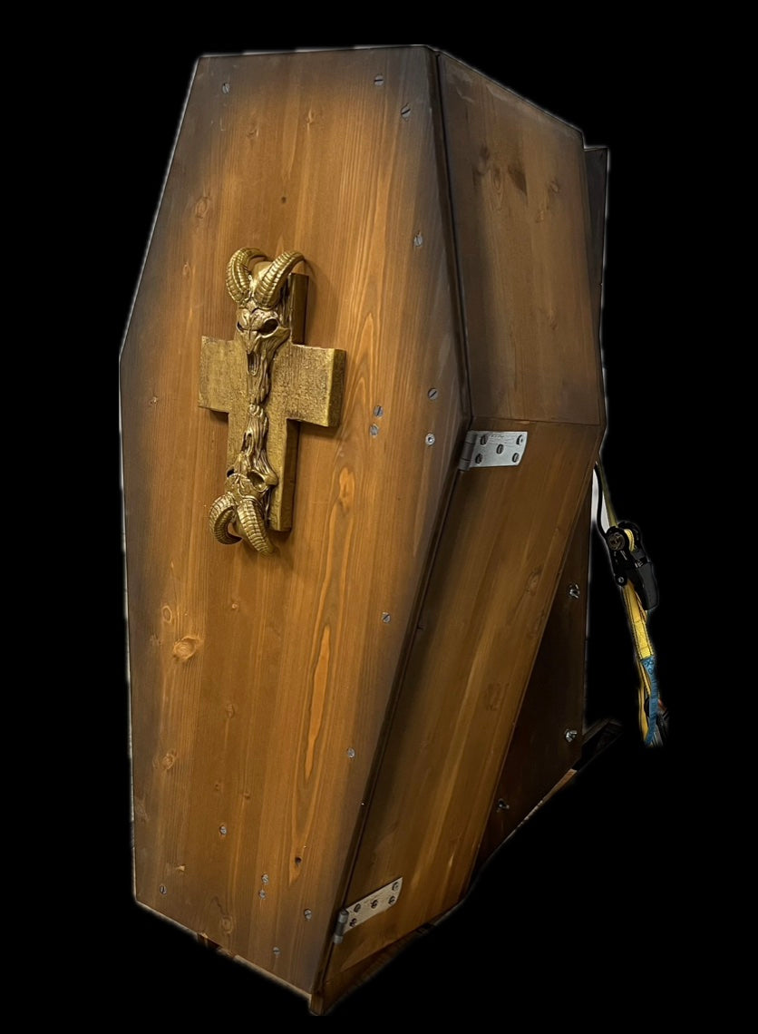 The upper body is pneumatically powered and folds out of the coffin. The coffin lid opens.